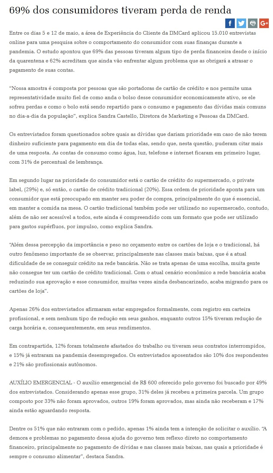 69% dos consumidores tiveram perda de renda