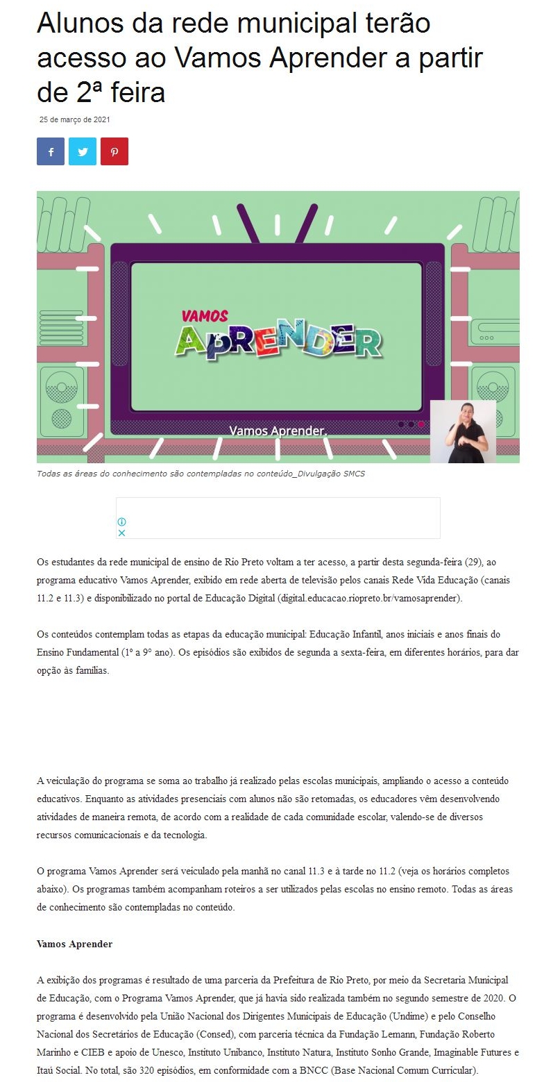 Alunos da rede municipal terão acesso ao Vamos Aprender a partir de 2ª feira