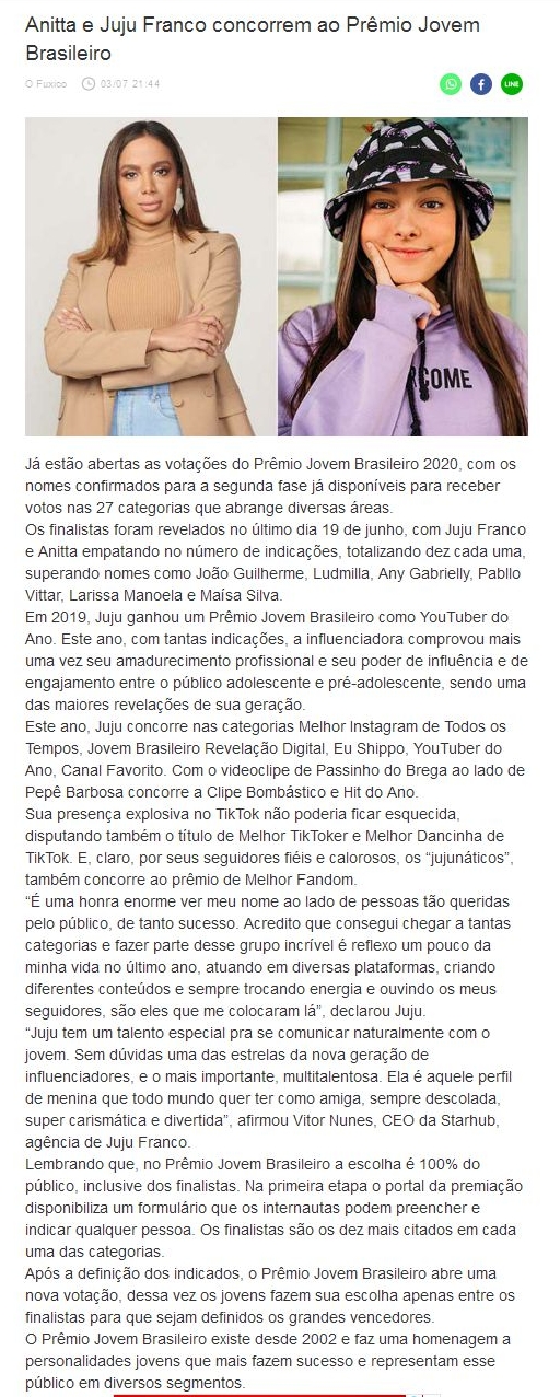Anitta e Juju Franco concorrem ao Prêmio Jovem Brasileiro