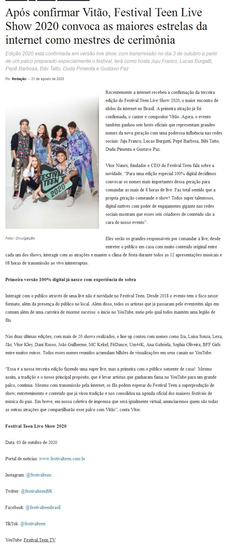 Após confirmar Vitão, Festival Teen Live Show 2020 convoca as maiores estrelas da internet como mestres de cerimônia