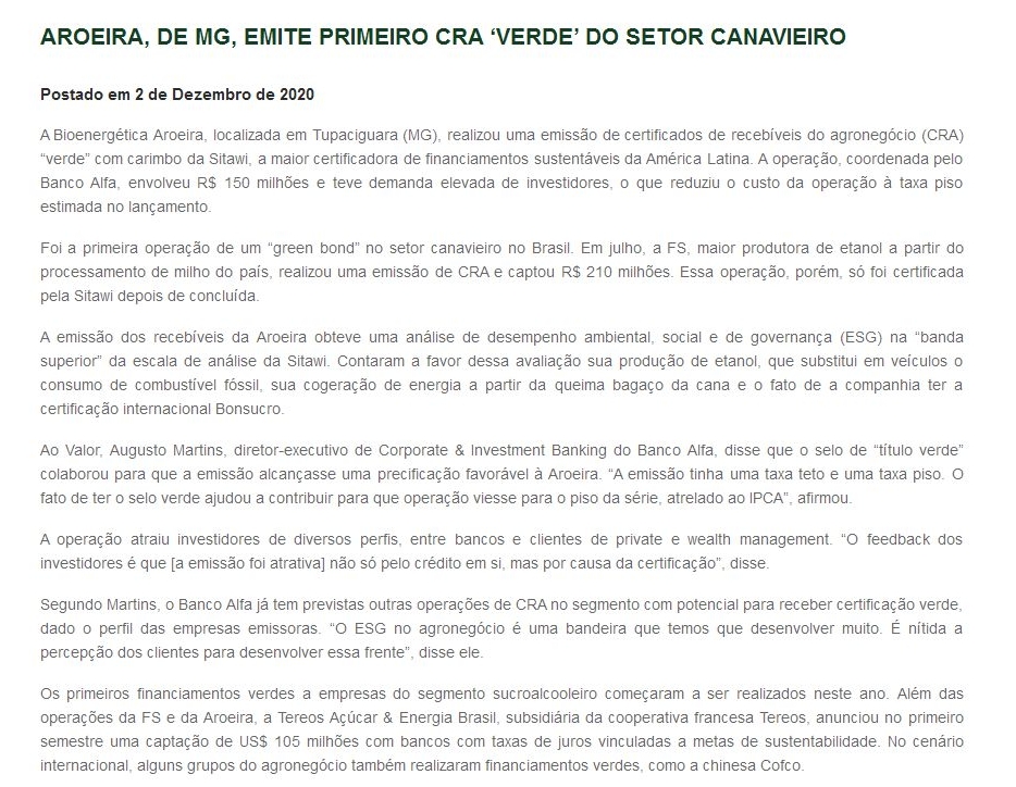 Aroeira, de MG, emite primeiro CRA ‘verde’ do setor canavieiro