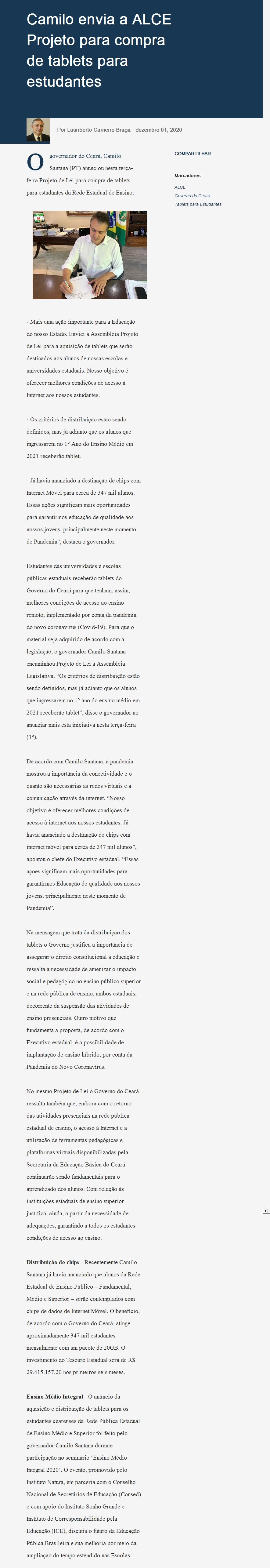 Camilo envia a ALCE Projeto para compra de tablets para estudantes
