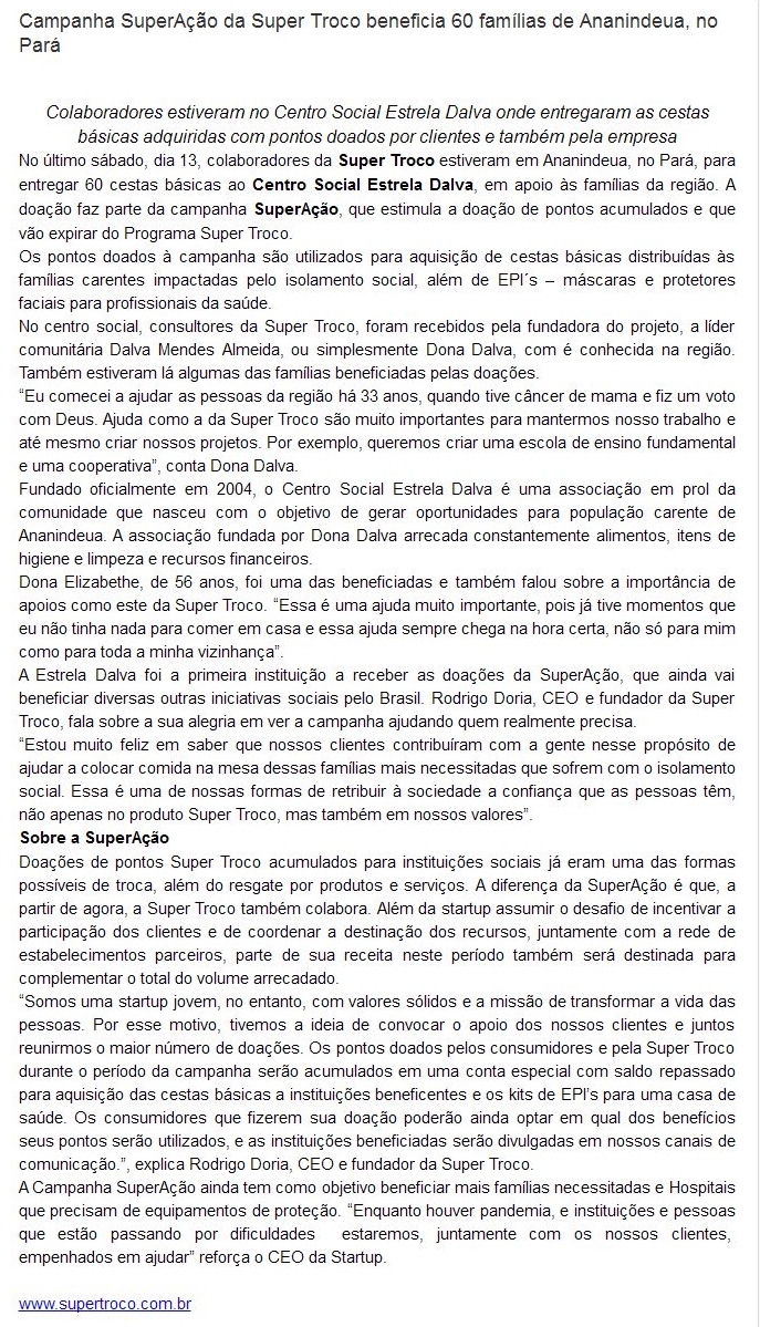 Campanha SuperAção da Super Troco beneficia 60 famílias de Ananindeua, no Pará