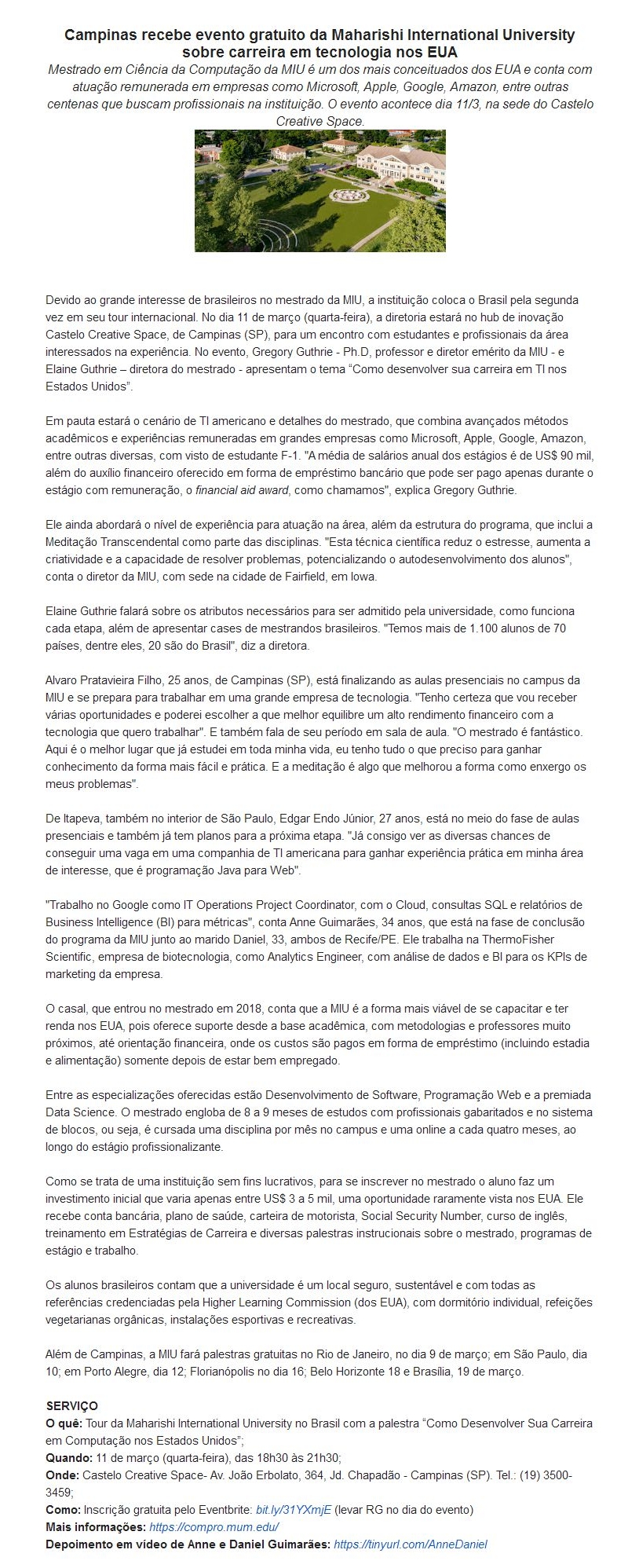 Campinas recebe evento gratuito da Maharishi International University sobre carreira em tecnologia nos EUA