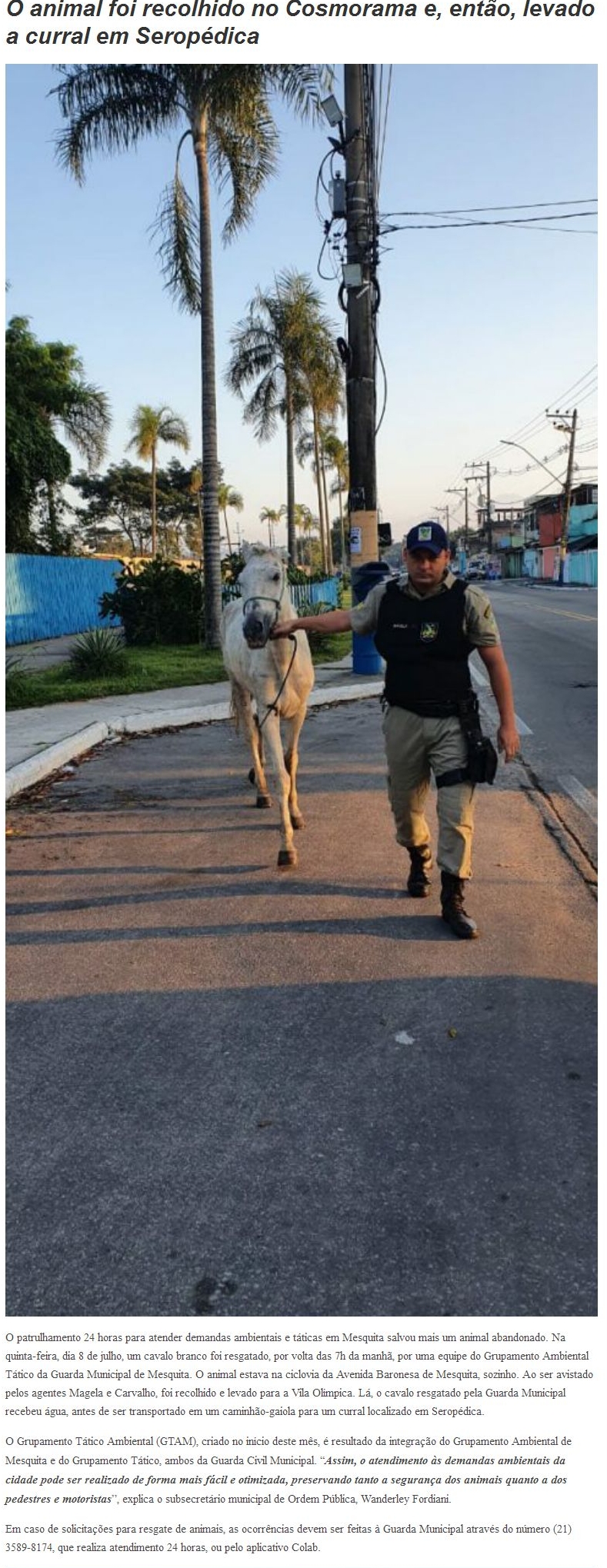 Cavalo é resgatado pela equipe da Guarda Municipal de Mesquita