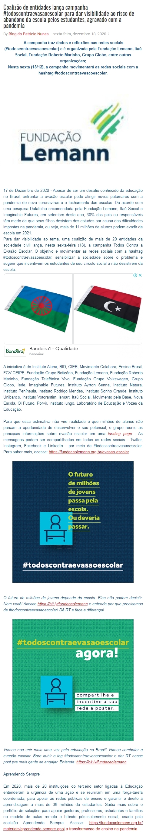 Coalizão de entidades lança campanha #todoscontraevasaoescolar para dar visibilidade ao risco de abandono da escola pelos estudantes, agravado com a p