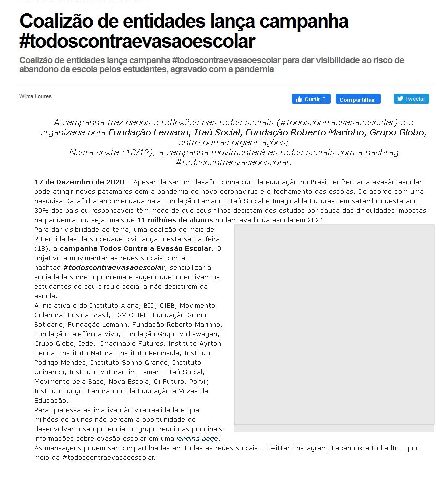 Coalizão de entidades lança campanha #todoscontraevasaoescolar