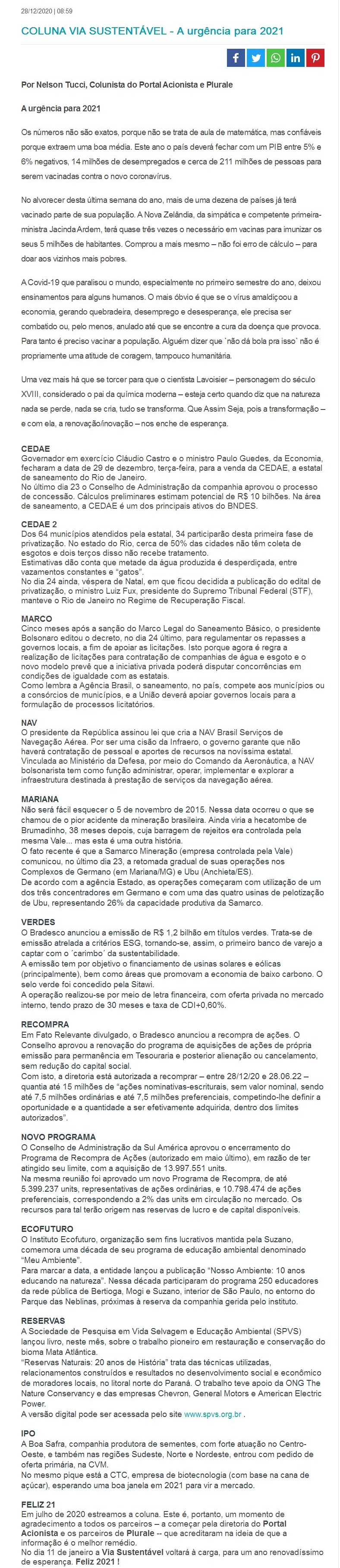 COLUNA VIA SUSTENTÁVEL - A urgência para 2021