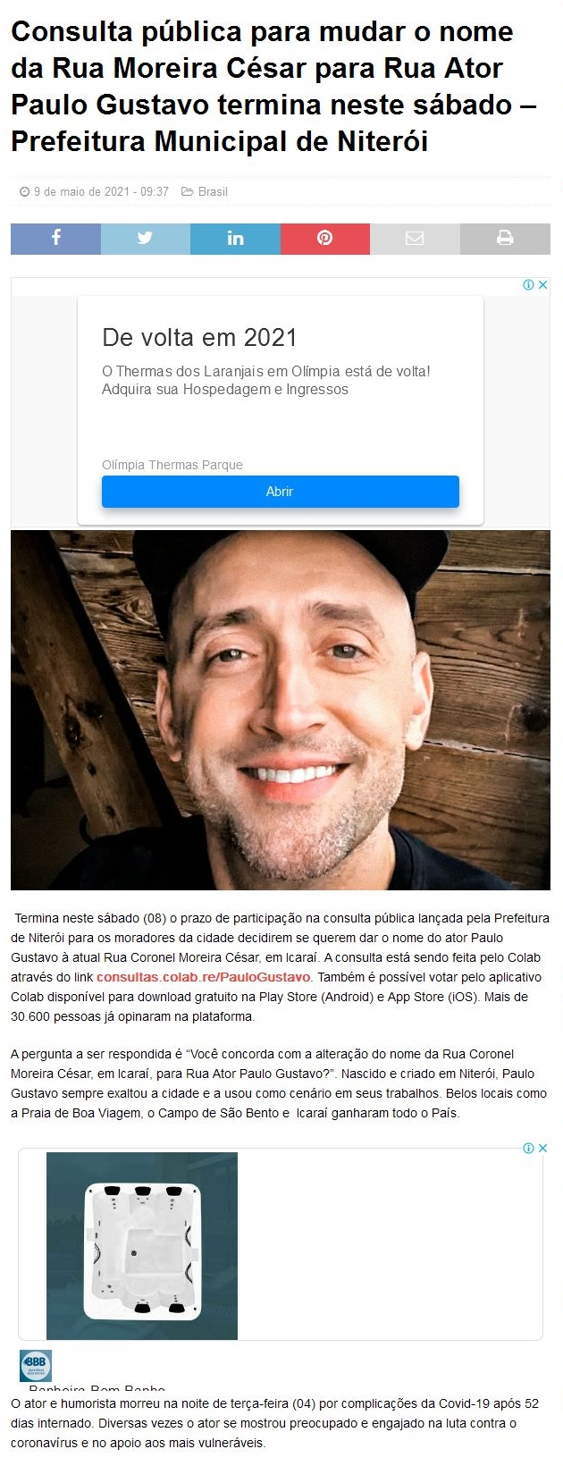 Consulta pública para mudar o nome da Rua Moreira César para Rua Ator Paulo Gustavo termina neste sábado – Prefeitura Municipal de Niterói - Defesa