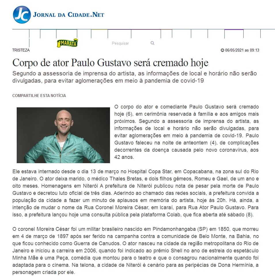 http://jornaldacidade.net/tv-e-famosos/2021/05/322148/corpo-de-ator-paulo-gustavo-sera-cremado-hoje.html