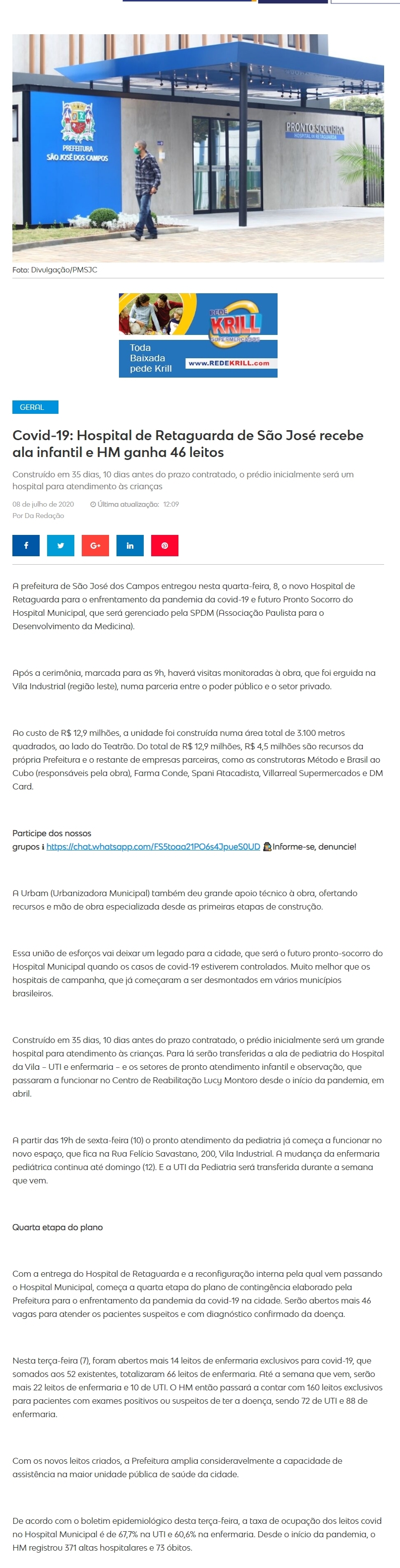 Covid-19: Hospital de Retaguarda de São José reecbe ala infantil e HM ganha 46 leitos