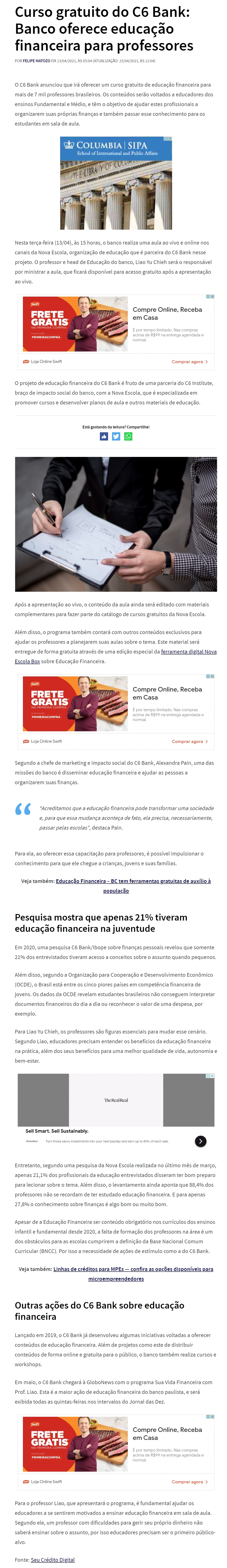 Curso gratuito do C6 Bank: Banco oferece educação financeira para professores