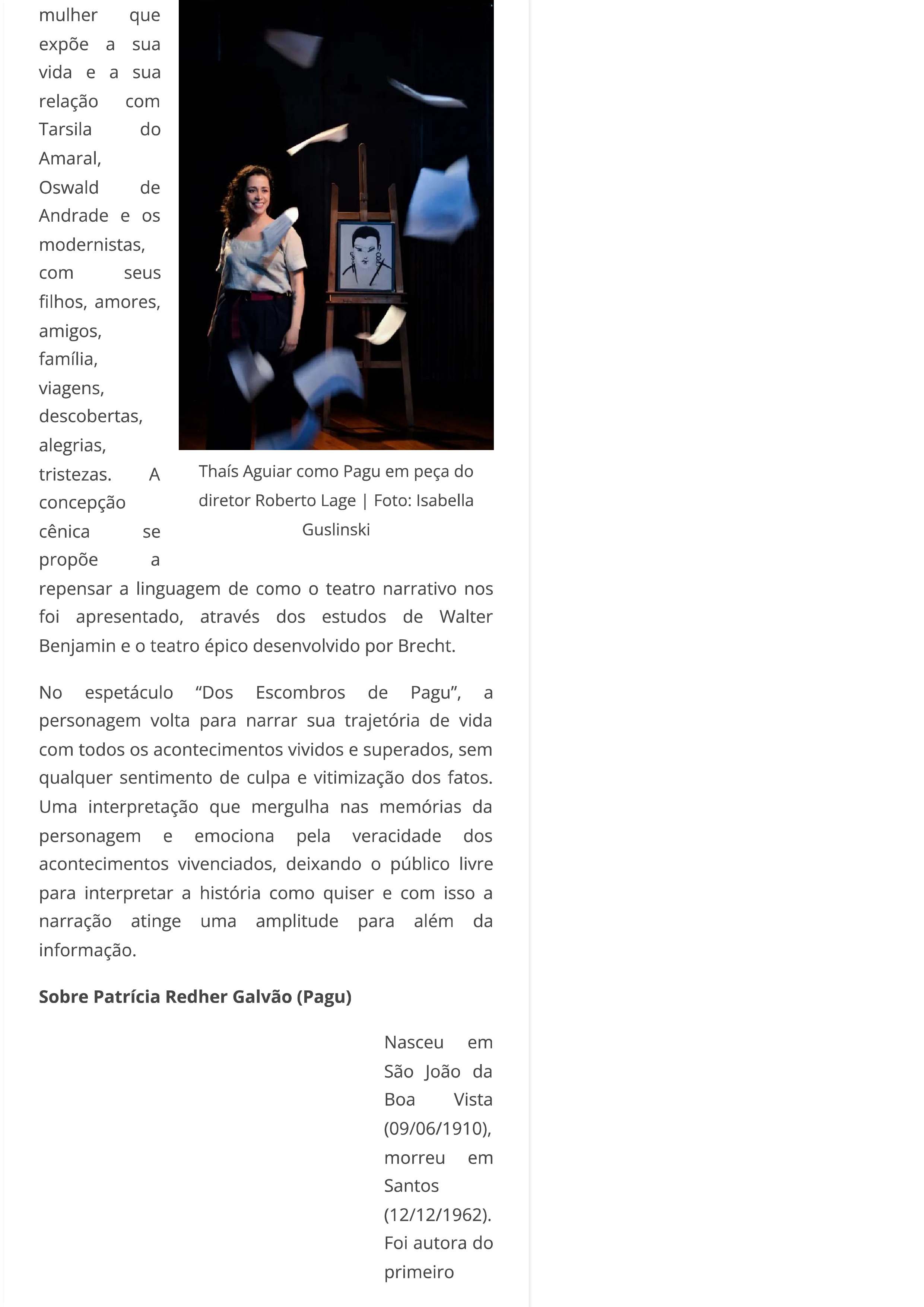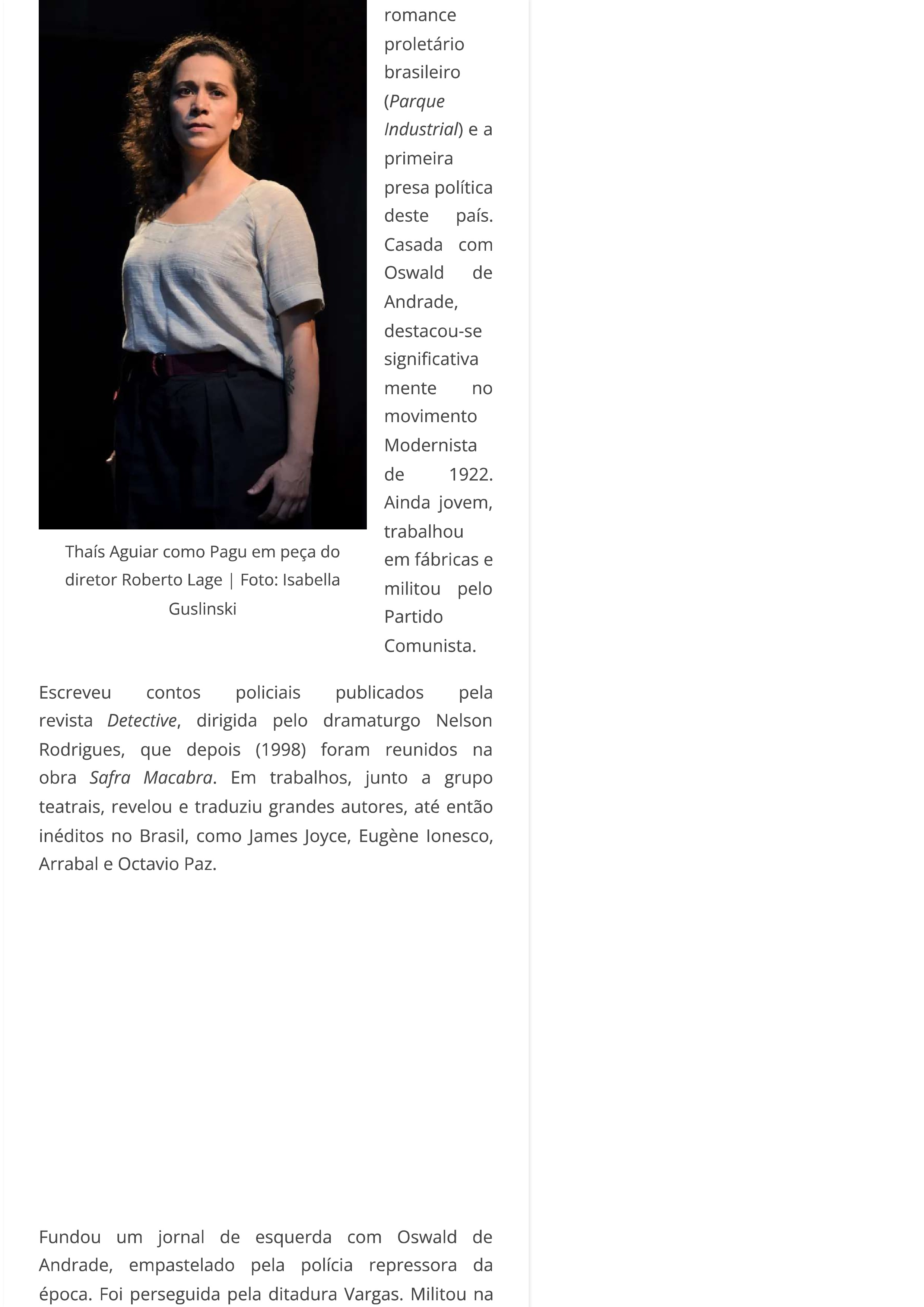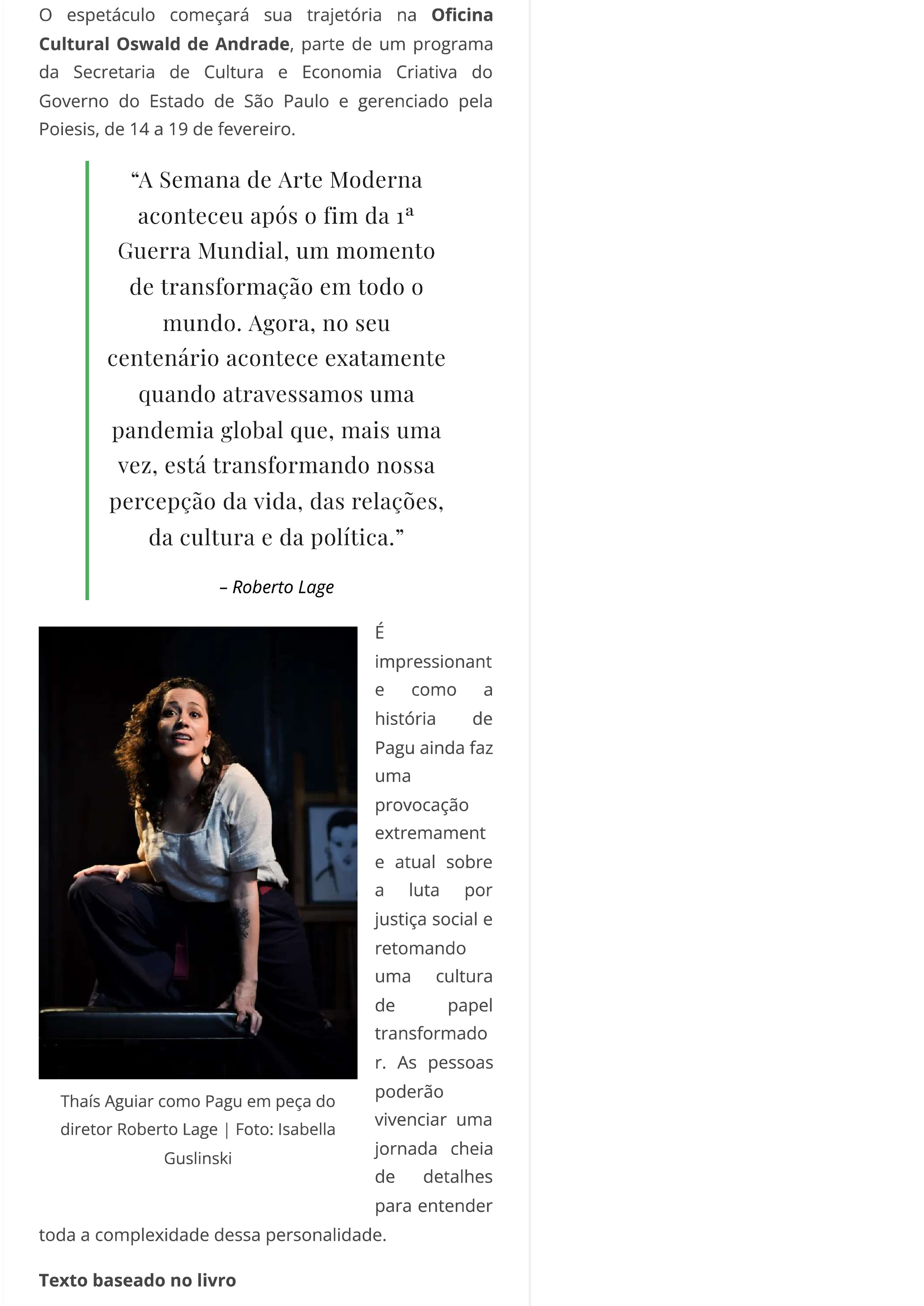 Diretor Roberto Lage leva vida de Pagu aos palcos da Oficina Cultural Oswald de Andrade no centenário da Semana de Arte Moderna de 1922