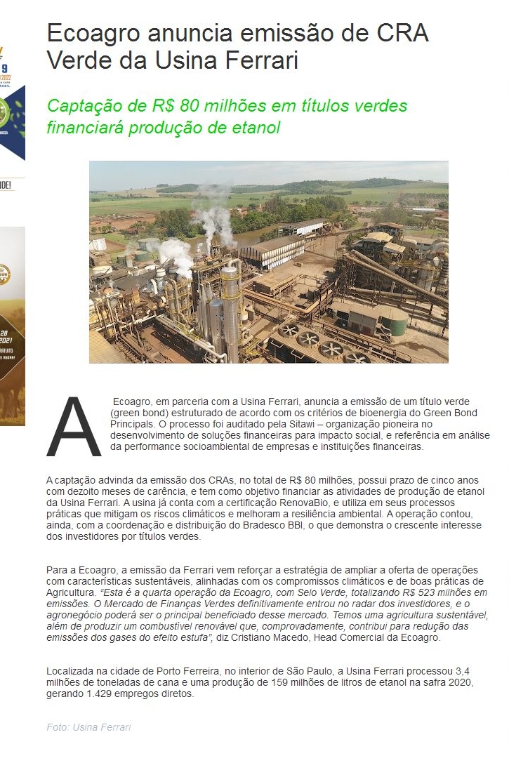 Ecoagro anuncia emissão de CRA Verde da Usina Ferrari