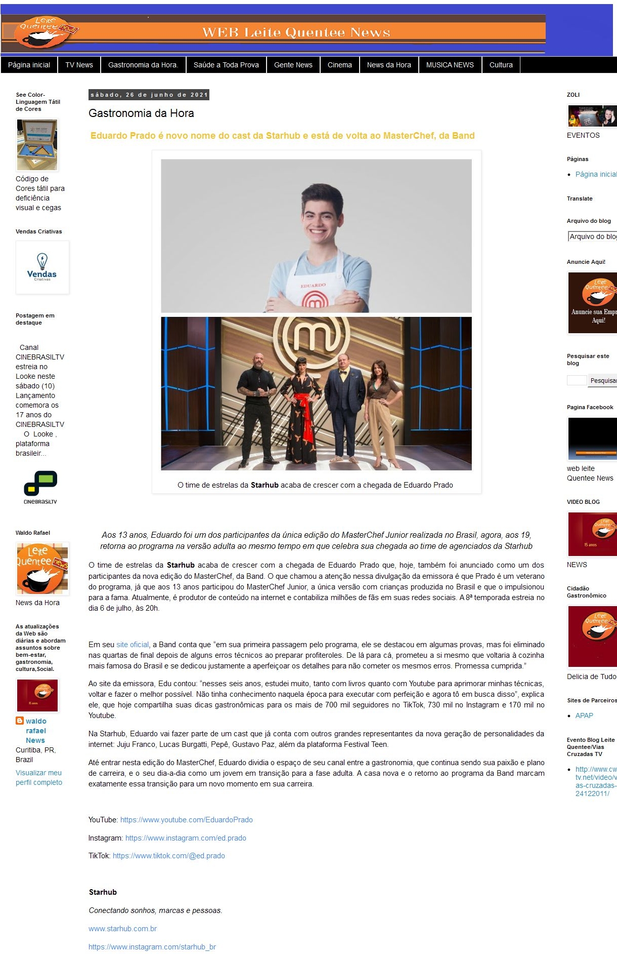 Eduardo Prado é novo nome do cast da Starhub e está de volta ao MasterChef, da Band