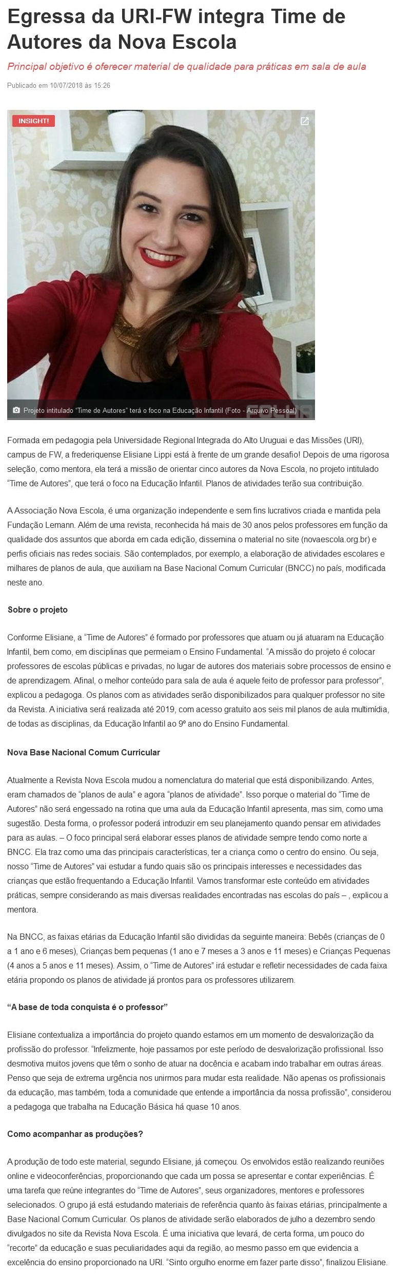 Egressa da URI-FW integra Time de Autores da Nova Escola