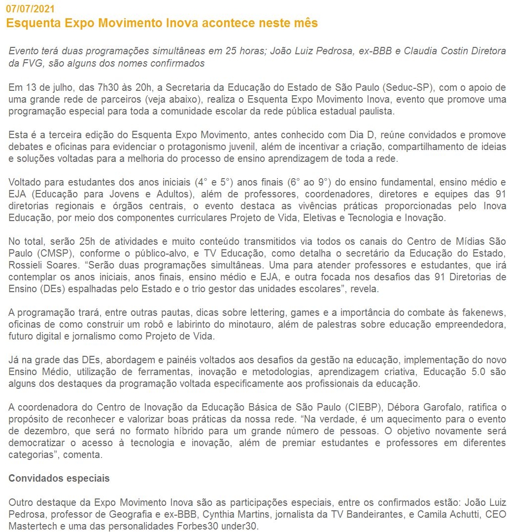 Esquenta Expo Movimento Inova acontece neste mês