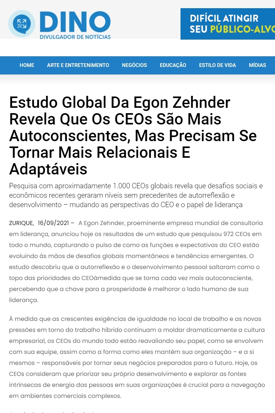 Estudo global da Egon Zehnder revela que os CEOs são mais autoconscientes, mas precisam se tornar mais relacionais e adaptáveis