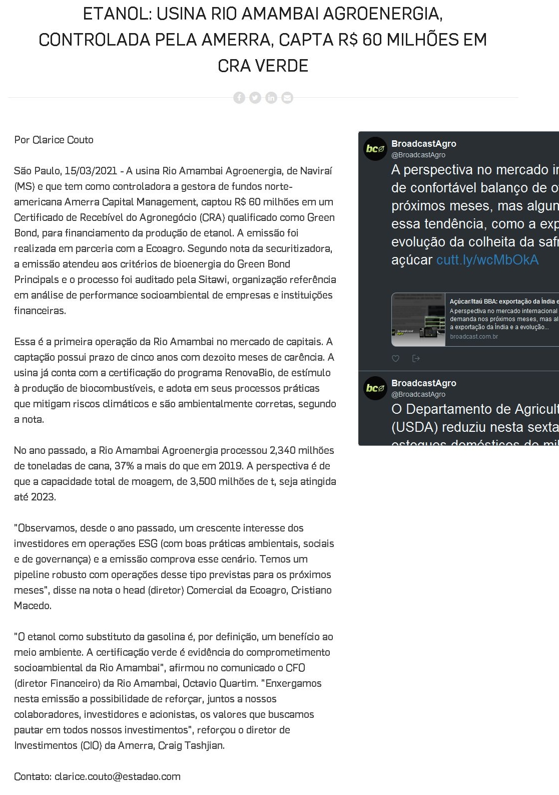 Etanol: usina Rio Amambai Agroenergia, controlada pela Amerra, capta R$ 60 milhões em CRA verde