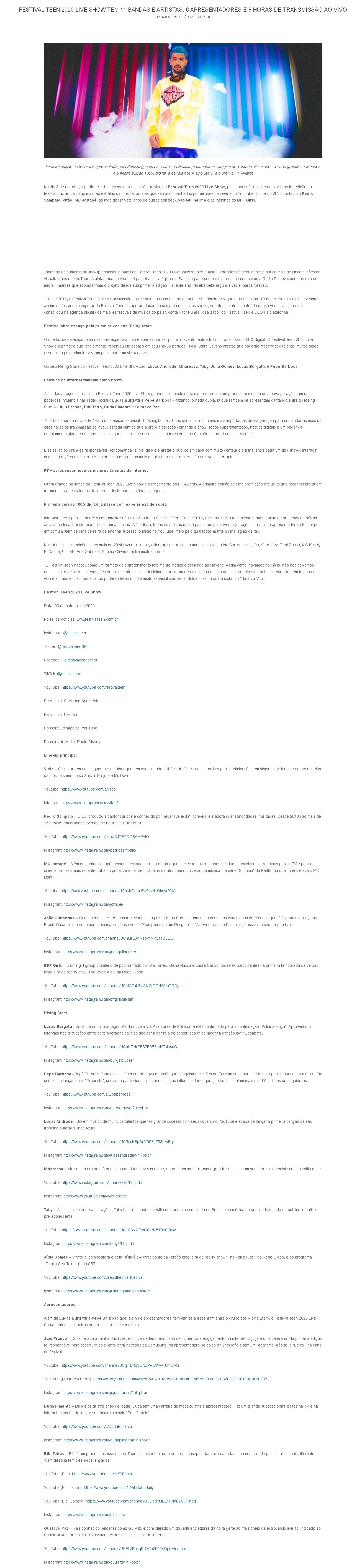 FESTIVAL TEEN 2020 LIVE SHOW TEM 11 BANDAS E ARTISTAS, 6 APRESENTADORES E 8 HORAS DE TRANSMISSÃO AO VIVO