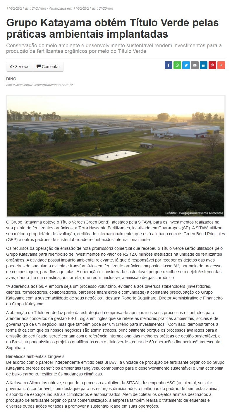 Grupo Katayama obtém Título Verde pelas práticas ambientais implantadas