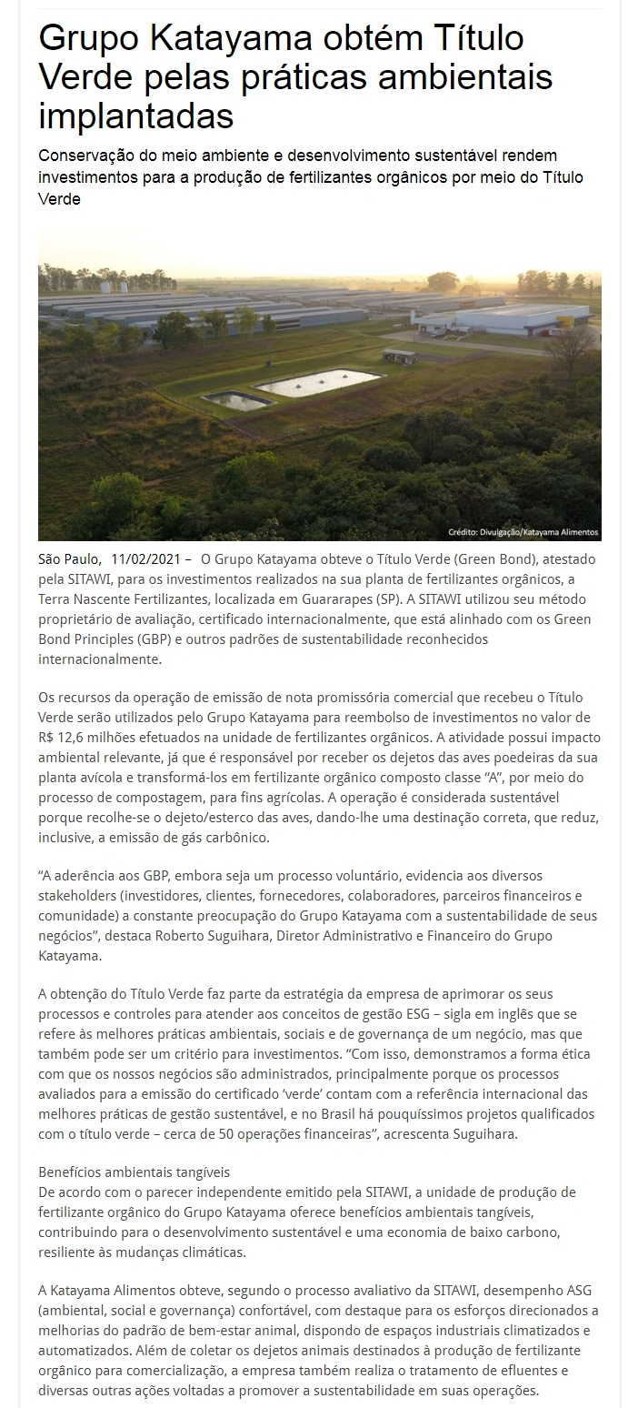 Grupo Katayama obtém Título Verde pelas práticas ambientais implantadas