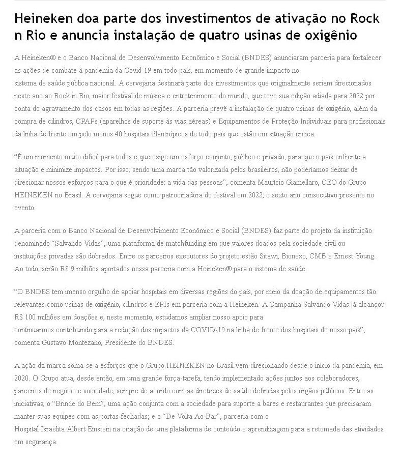 Heineken doa parte dos investimentos de ativação no Rock n Rio e anuncia instalação de quatro usinas de oxigênio