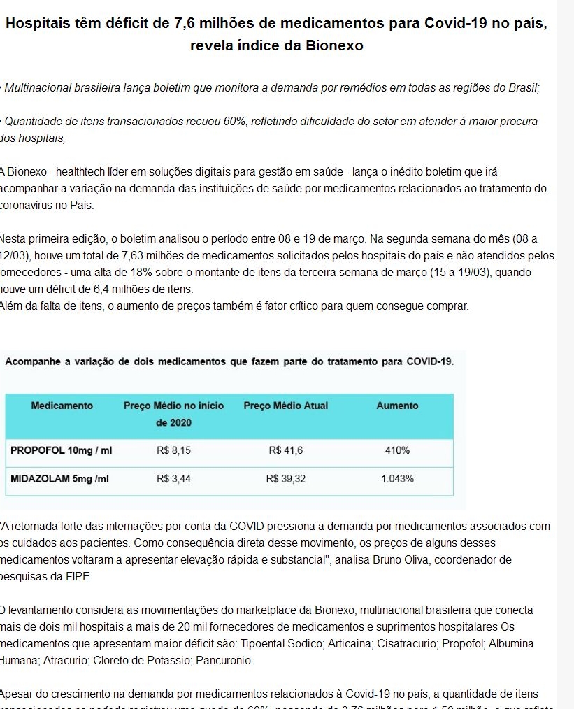 Hospitais têm déficit de 7,6 milhões de medicamentos para Covid-19 no país, revela índice da Bionexo