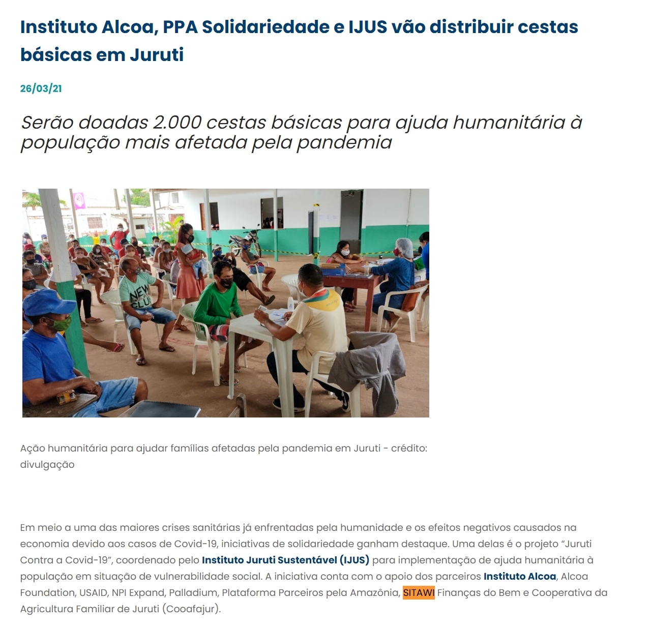 Instituto Alcoa, PPA Solidariedade e IJUS vão distribuir cestas básicas em Juruti
