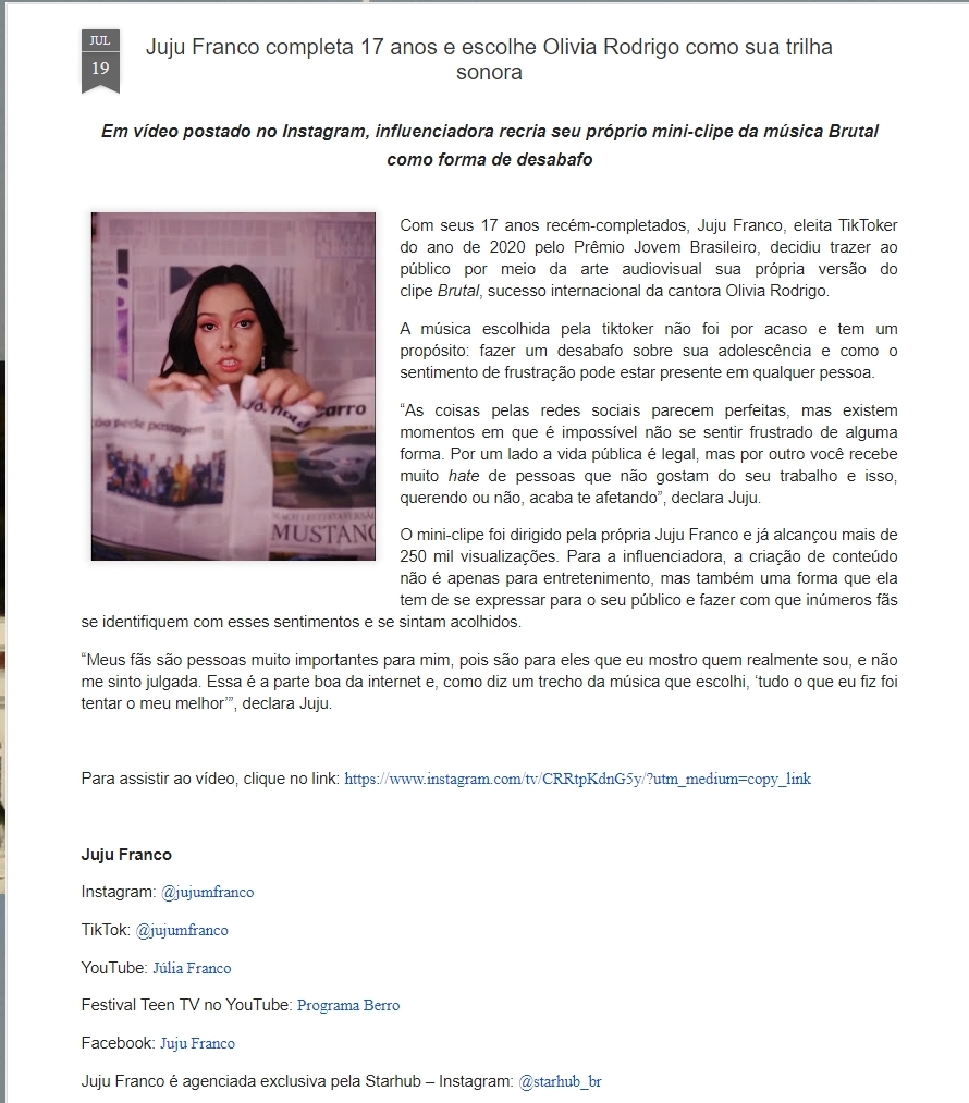 Juju Franco completa 17 anos e escolhe Olivia Rodrigo como sua trilha sonora