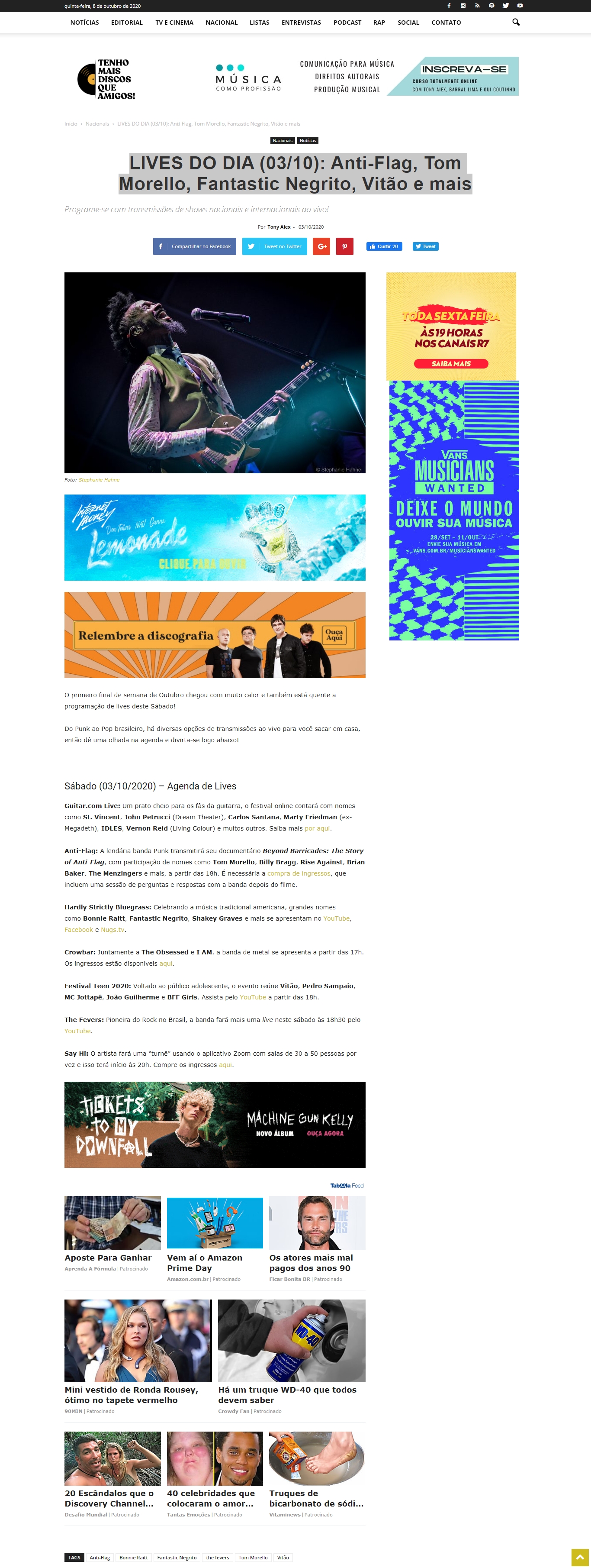 LIVES DO DIA (03/10): Anti-Flag, Tom Morello, Fantastic Negrito, Vitão e mais