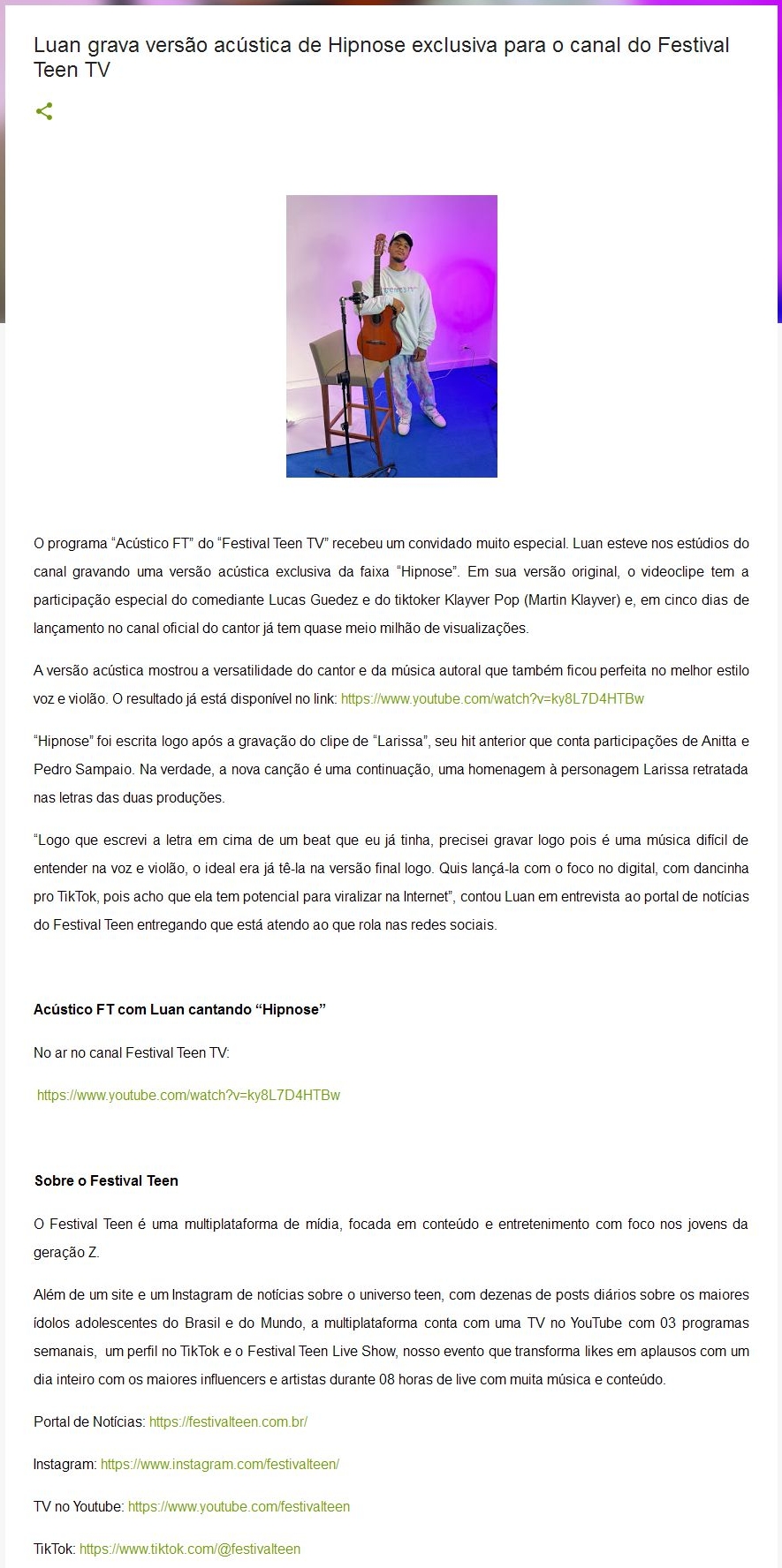 Luan grava versão acústica de Hipnose exclusiva para o canal do Festival Teen TV