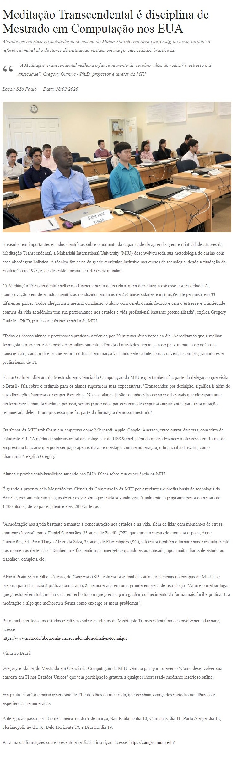 Meditação Transcendental é disciplina de Mestrado em Computação nos EUA