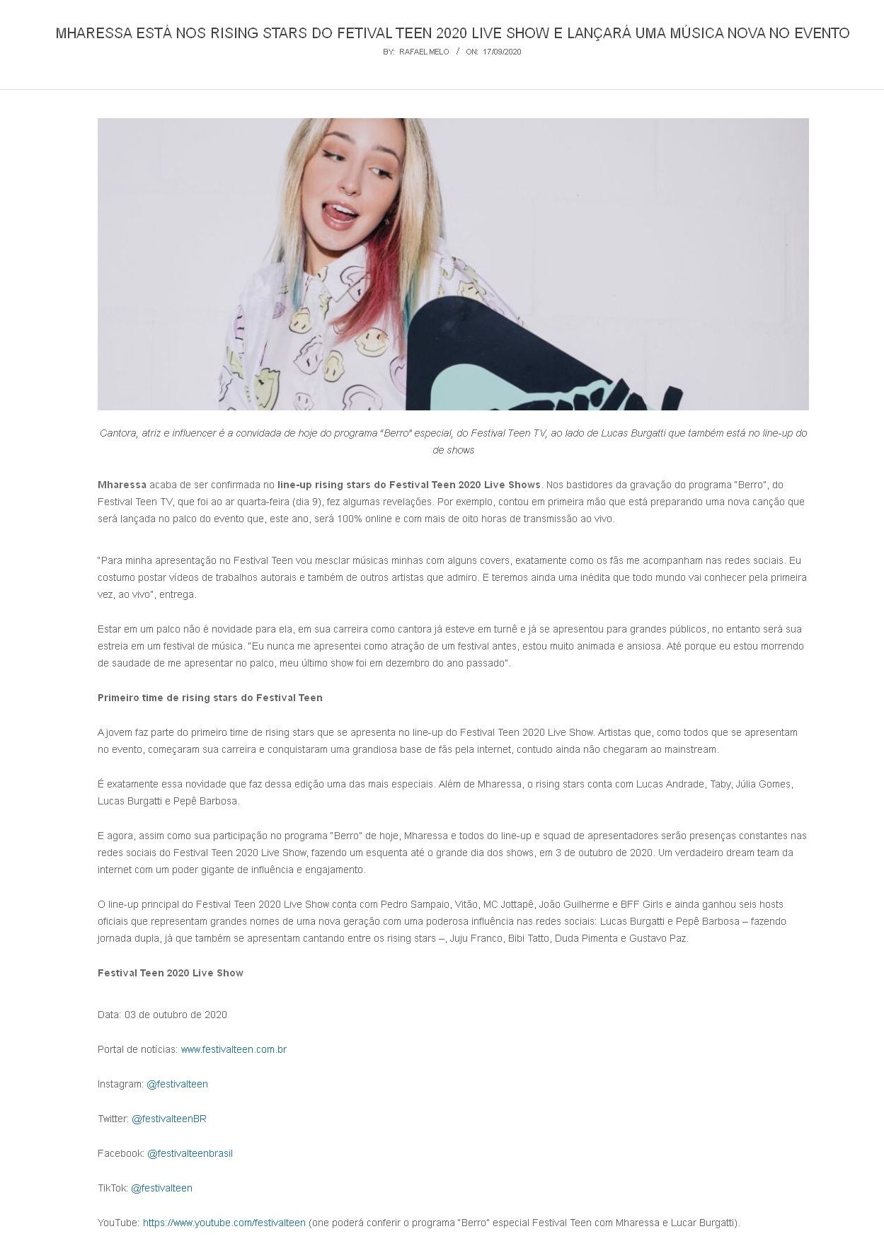 MHARESSA ESTÁ NOS RISING STARS DO FETIVAL TEEN 2020 LIVE SHOW E LANÇARÁ UMA MÚSICA NOVA NO EVENTO