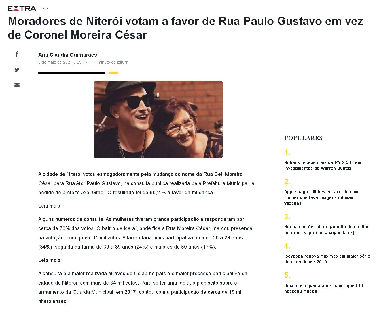 Moradores de Niterói votam a favor de Rua Paulo Gustavo em vez de Coronel Moreira César