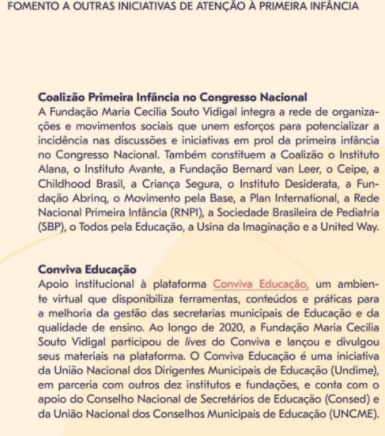 20/07/2021 - O FOMENTO A OUTRAS INICIATIVAS DE ATENÇÃO À PRIMEIRA INFÂNCIACoalizão Primeira Infância no Congresso Nacional A Fundação Maria Cecilia Souto Vidigal integra a rede de organizações e movimentos sociais