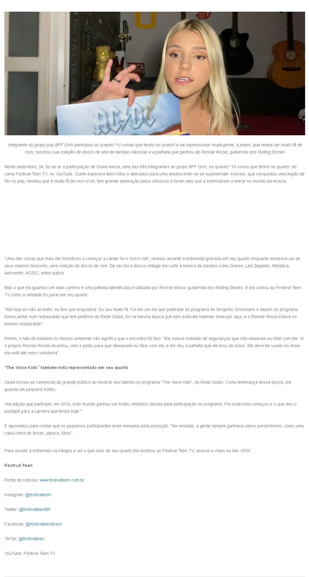 "O rock n'roll foi o que me incentivou a começar a cantar", revelou Giulia Nassa em entrevista ao Festival Teen TV