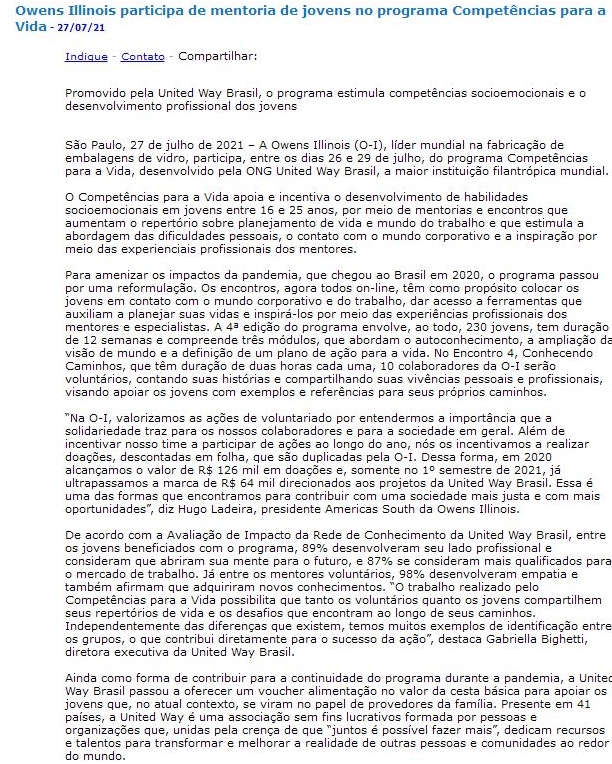 Owens Illinois participa de mentoria de jovens no programa Competências para a Vida