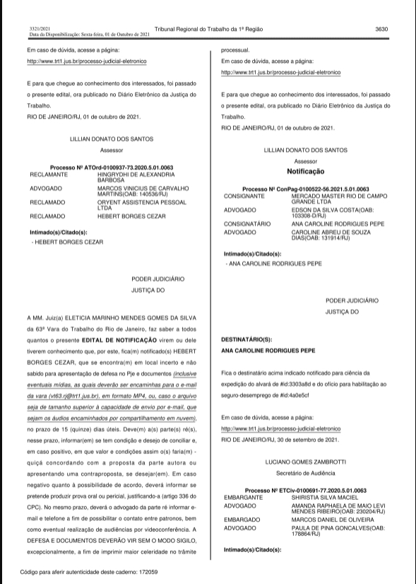 Página Diário Oficial 3630 (01/10/2021) - Fonte: Diario Oficial Caderno do TRT da 1ª Região - Judiciário