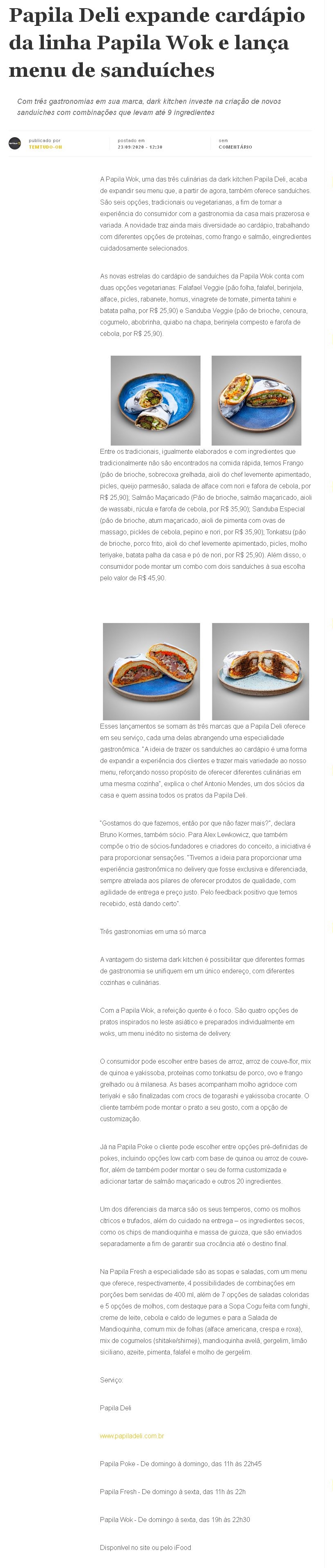 Papila Deli expande cardápio da linha Papila Wok e lança menu de sanduíches