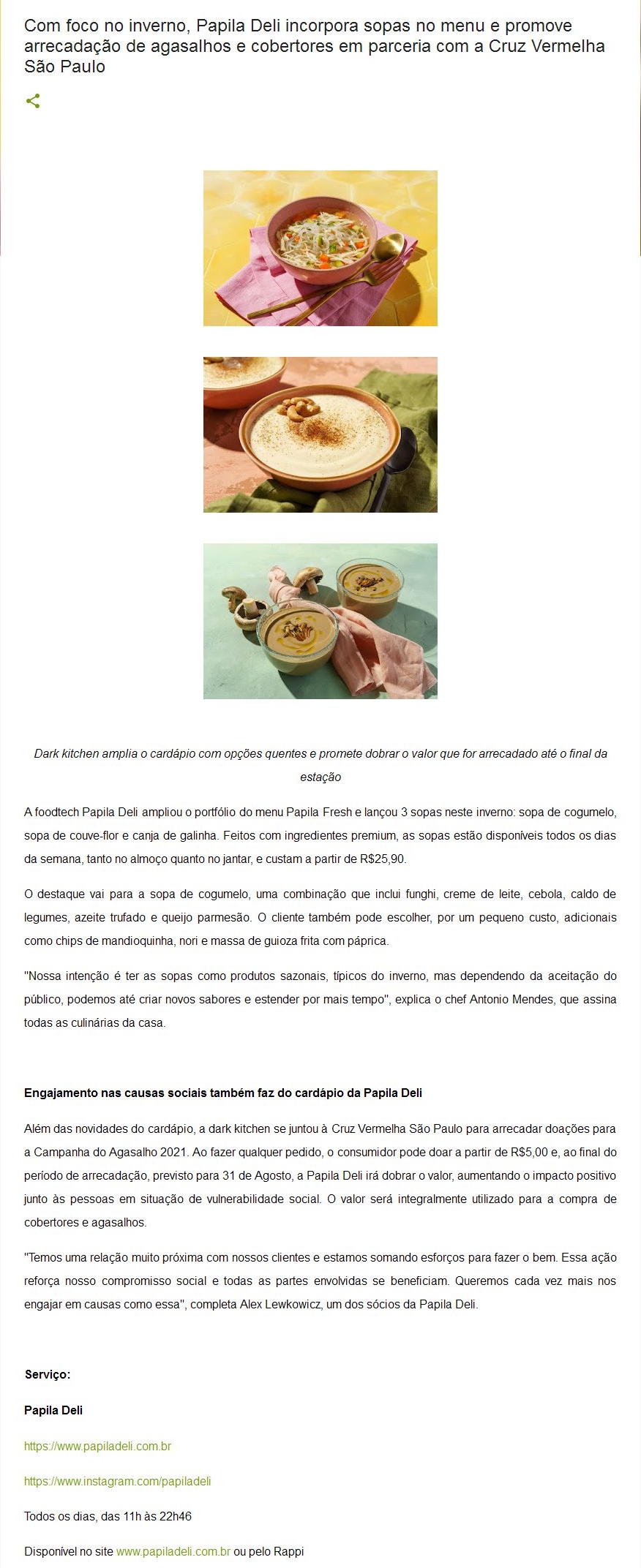 Papila Deli incorpora sopas no menu e promove arrecadação de agasalhos e cobertores em parceria com a Cruz Vermelha São Paulo