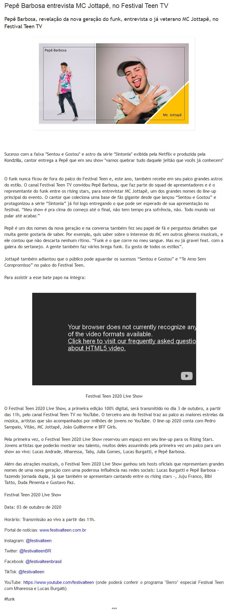 Pepê Barbosa entrevista MC Jottapê, no Festival Teen TV