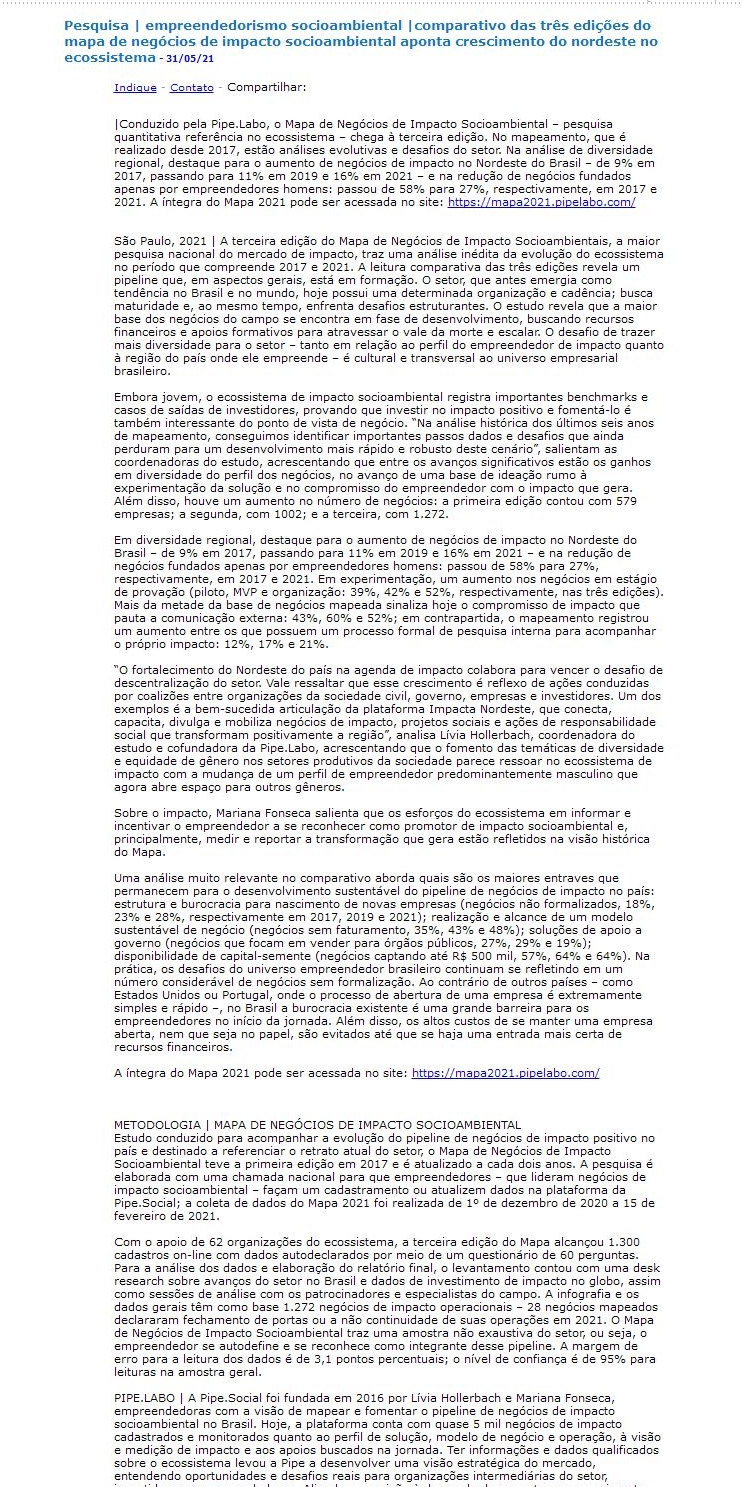 Pesquisa | empreendedorismo socioambiental |comparativo das três edições do mapa de negócios de impacto socioambiental aponta crescimento do nordeste