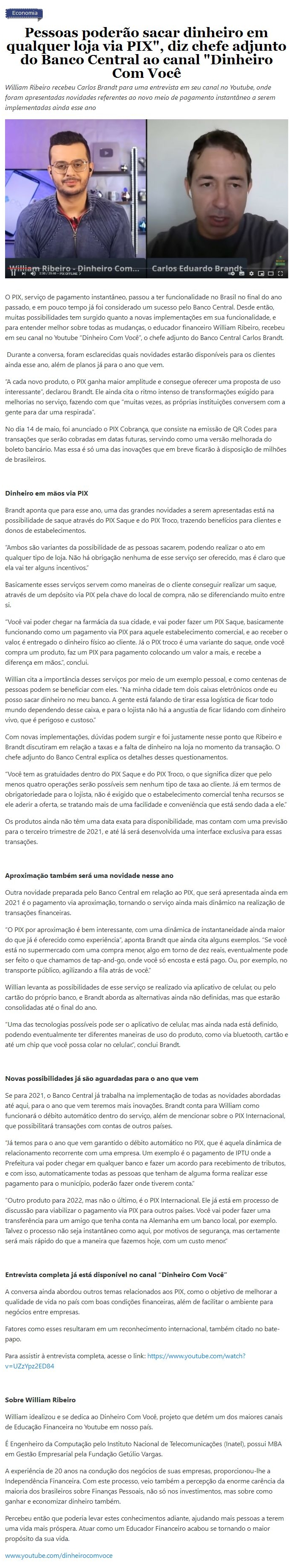 "Pessoas poderão sacar dinheiro em qualquer loja via PIX", diz chefe adjunto do Banco Central ao canal "Dinheiro Com Você"