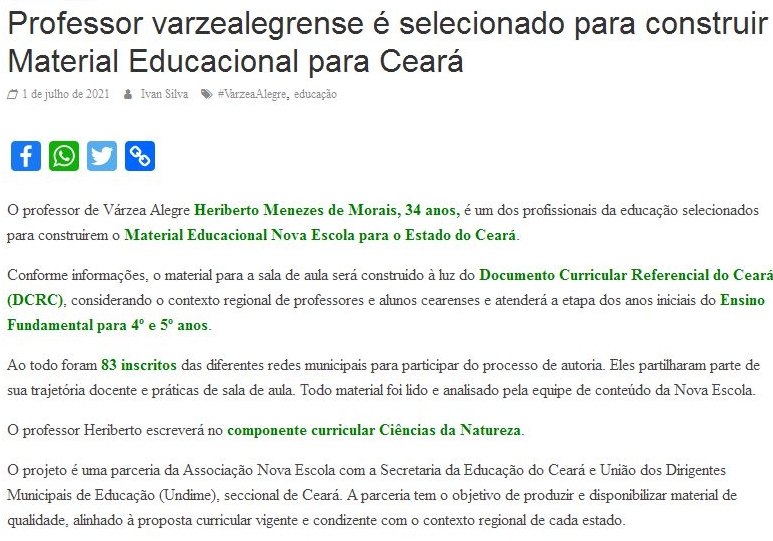 Professor varzealegrense é selecionado para construir Material Educacional para Ceará