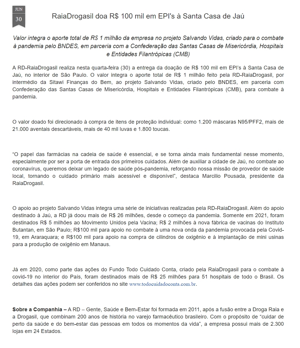 RaiaDrogasil doa R$ 100 mil em EPI's ą Santa Casa de Jaś