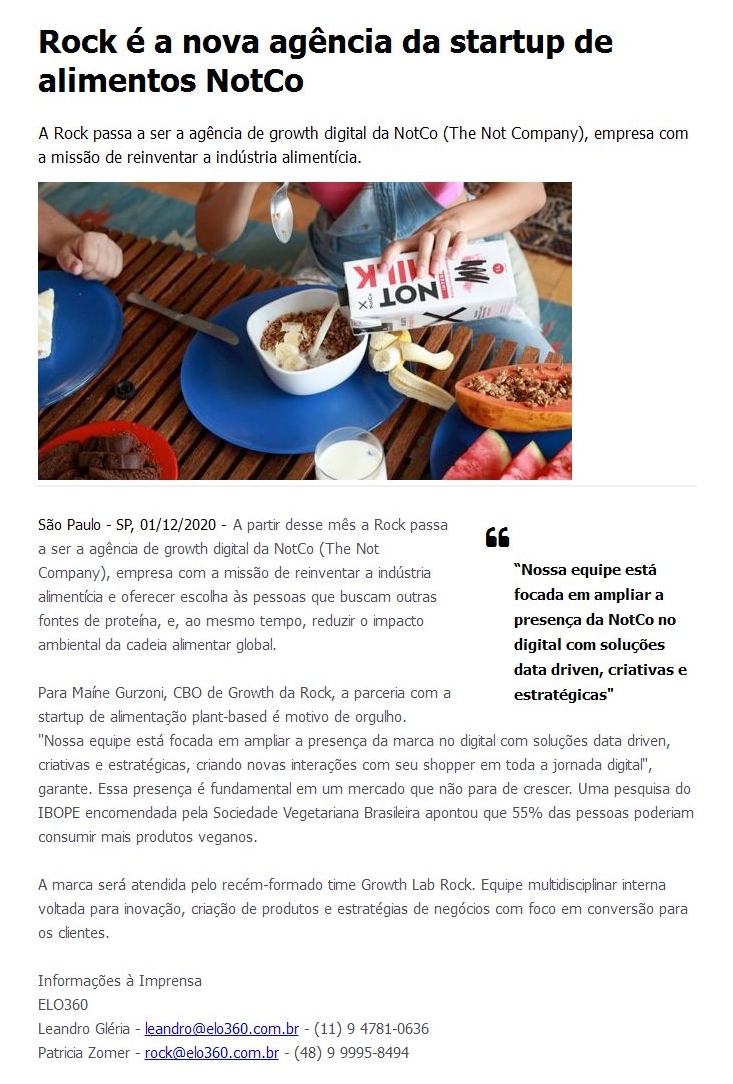 Rock é a nova agência da startup de alimentos NotCo