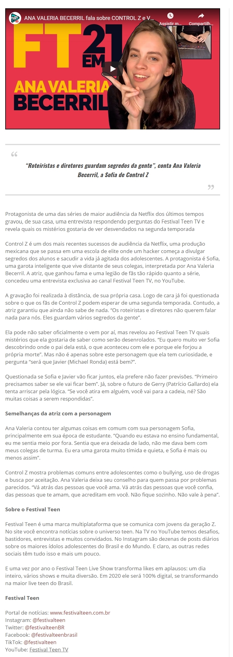 "Roteiristas e diretores guardam segredos da gente", conta Ana Valeria Becerril, a Sofia de Control Z