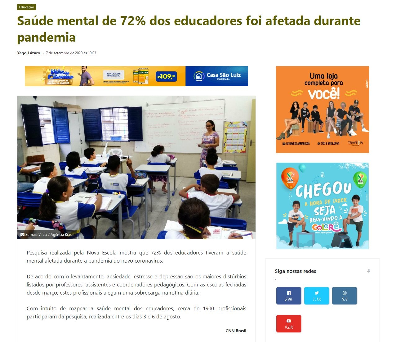 Saúde mental de 72% dos educadores foi afetada durante pandemia