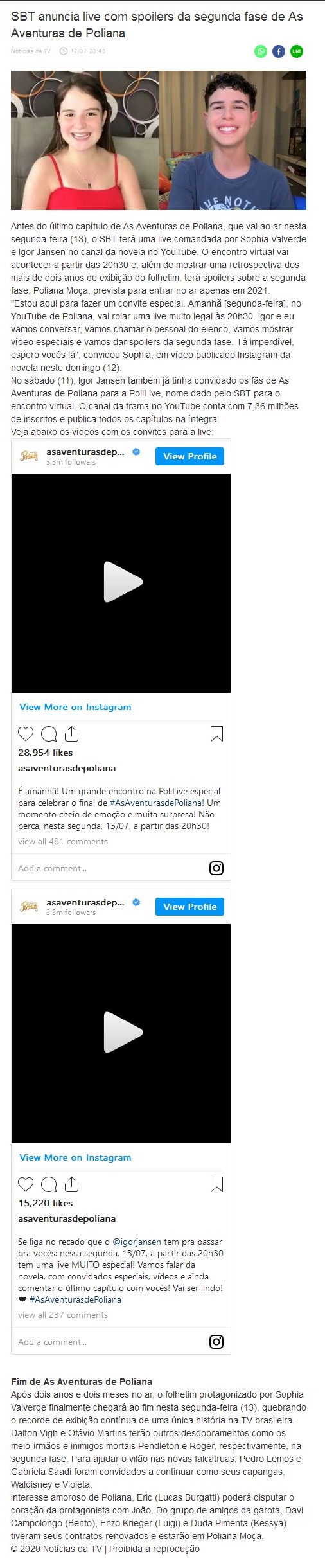 SBT anuncia live com spoilers da segunda fase de As Aventuras de Poliana